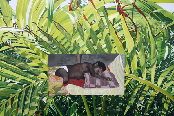 As with the Rarotongan and Samoan garden paintings the works in the series Postcards from Vila are produced from the artist's photographic records. Here the original photographs are cropped and combined to create double or multiple images in the manner of postcards, advertising billboards and tourist booklets.